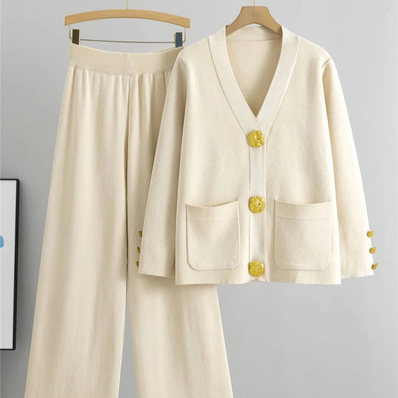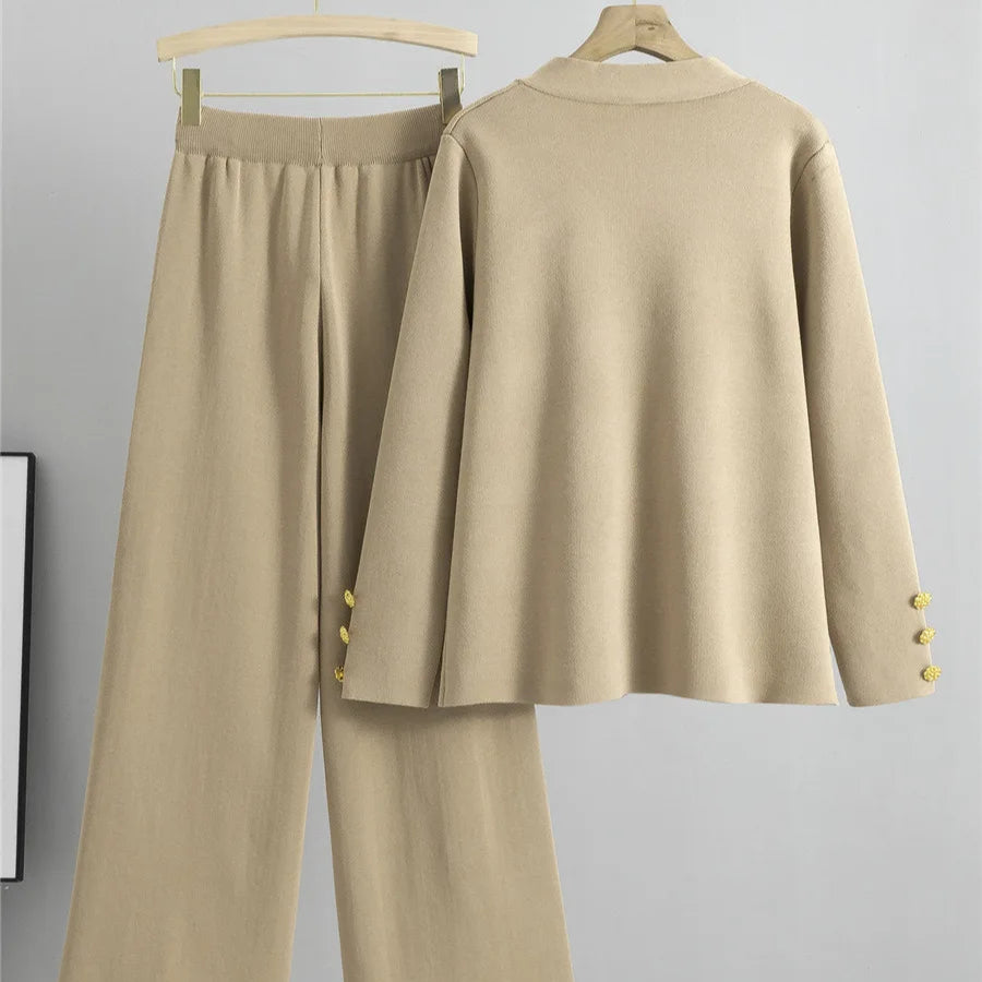 Dzianinowy komplet damski z krótkim rękawem i spodniami wide leg