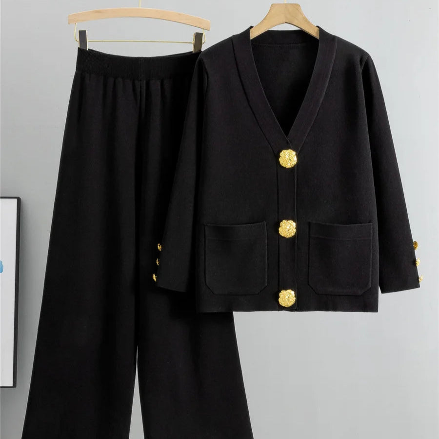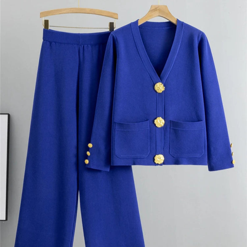 Dzianinowy komplet damski z krótkim rękawem i spodniami wide leg to nowoczesna propozycja dla kobiet, które cenią sobie połączenie wygody i elegancji. Góra o klasycznym kroju z efektownymi guzikami dodaje całości szyku, a jednocześnie sprawia, że komplet wygląda niezwykle stylowo zarówno w codziennych stylizacjach, jak i w bardziej oficjalnych okazjach.